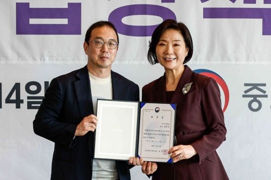 송병준 벤처기업협회장이 14일 서울 여의도 CCMM빌딩에서 열린 '2025년 제1차 중소기업정책심의회'에 참석해 오영주 중소벤처기업부 장관에게 중소기업정책심의회 위원 위촉장을 전달 받은 뒤 사진촬영 하고 있다.