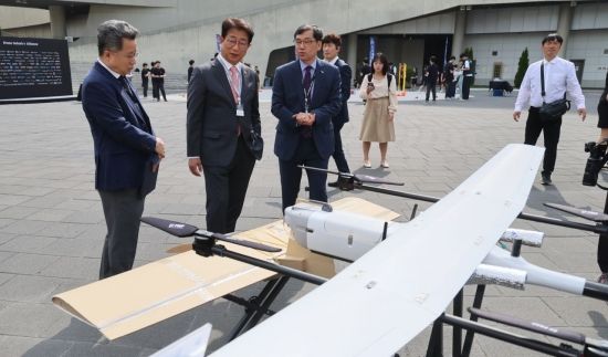14일 서울 강서구 코엑스 마곡에서 열린 드론산업 얼라이언스 창립총회에 참석한 박상우 국토교통부 장관이 전시중인 방산 드론을 살펴보고 있다.