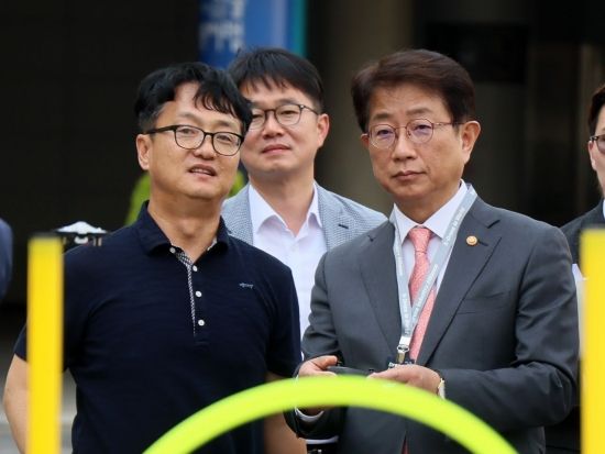 14일 서울 강서구 코엑스 마곡에서 열린 드론산업 얼라이언스 창립총회에 참석한 박상우 국토교통부 장관이 교육용 드론을 직접 조종해보고 있다.
