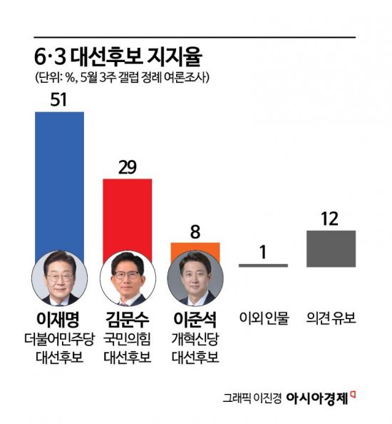 16일 여론조사 업체 갤럽이 공개한 여론조사(13~15일 전국 18세 이상 1004명 대상으로 무선전화 인터뷰 방식·표본오차는 95% 신뢰수준에 ±3.1%포인트·응답률은 16.4%)에 따르면 6·3 대선 지지후보 조사에서 이재명 후보는 51%로 오차 범위를 넘어선 격차로 1위를 차지했다. 김문수 국민의힘 대선 후보는 29%, 이준석 개혁신당 대선 후보는 8%로 나타났다. 기타 후보는 1%였고, 12%는 의견을 유보했다.