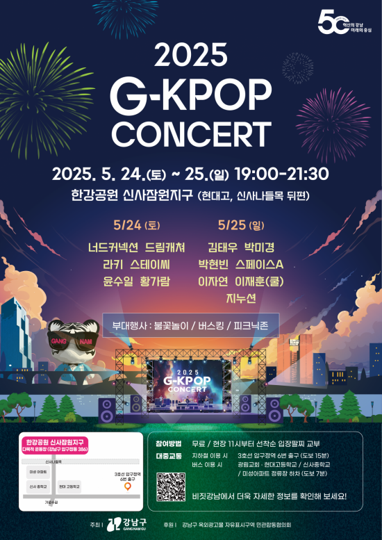 G-KPOP 콘서트는 24~25일 오후 7시부터 9시 30분까지 한강공원 신사잠원지구에서 무료로 진행된다. 24일에는 스테이씨, 드림캐쳐, 너드커넥션, 황가람, 라키, 윤수일, 25일에는 김태우, 이재훈(쿨), 지누션, 박미경, 스페이스A, 이자연, 박현빈 등 총 13팀이 무대에 오른다.