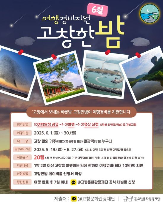 전북 고창문화관광재단(이하 재단)은 여행경비 지원사업인 '고창한밤'이 6월 여행자 대상으로 경비를 지원한다고 19일 밝혔다.