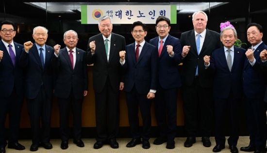 김문수 국민의힘 대선 후보가 19일 서울 중구 부영 태평빌딩에서 열린 대한노인회 간담회에 참석해 이중근 노인회장을 비롯한 참석자들과 기념촬영을 하고 있다.