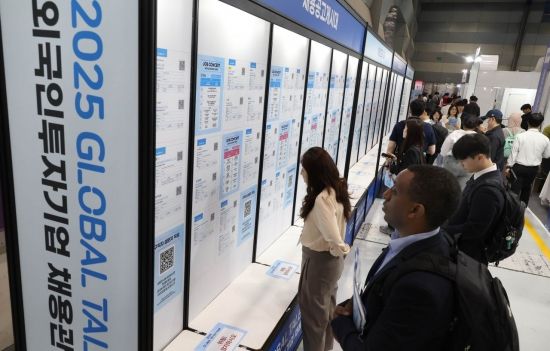 19일 서울 강남구 삼성동 코엑스에서 열린 '2025 글로벌 탤런트 페어'(Global Talent Fair)' 를 찾은 많은 취업 준비생과 외국인 유학생들이 채용공고게시판을 살펴보고 있다.