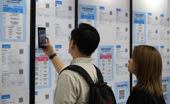 19일 서울 강남구 삼성동 코엑스에서 열린 '2025 글로벌 탤런트 페어'(Global Talent Fair)' 를 찾은 취업 준비생과 외국인 유학생들이 채용공고를 휴대폰에 담고 있다.