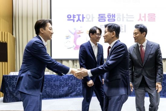 김문수 국민의힘 대선 후보와 이준석 개혁신당 대선 후보가 19일 서울시청에서 열린 약자와 동행하는 서울 토론회에서 기념촬영을 마친 후 악수하고 있다.