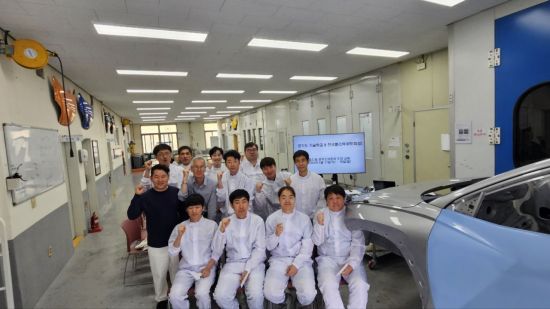 경기도일자리재단이 17~18일 이틀간 한국폴리텍대학교 화성캠퍼스에서 경기도기술학교 자동차정비학과 교육생을 대상으로 ‘자동차 도장 실습 교육’을 진행했다. 교육 참가자들이 기념사진을 찍고 있다. 경기도일자리재단 제공
