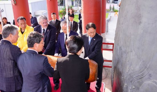 강기정 광주시장이 지난 18일 오후 5·18민주광장 내 민주의 종각에서 제45주년 5·18민주화운동을 기념하기 위해 신수정 광주시의회 의장, 이정선 광주시교육감, 양부남 더불어민주당 광주시당위원장, 5·18 기관·단체장 등과 함께 타종을 하고 있다. 광주시 제공
