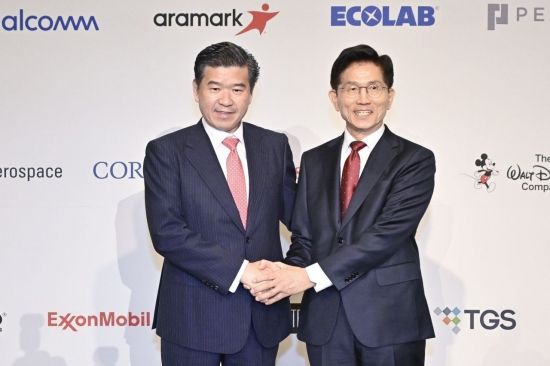 김문수 국민의힘 대선후보와 제임스 김 주한미국상공회의소(암참) 회장이 19일 서울 종로구 포시즌스호텔에서 열린 주한미국상공회의소(암참) 간담회에서 기념촬영을 하고 있다.
