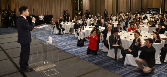 김문수 국민의힘 대선 후보가 19일 서울 종로구 포시즌스호텔에서 열린 주한미국상공회의소(AMCHAM·암참) 초청 특별 오찬 간담회에서 발언을 하고 있다.