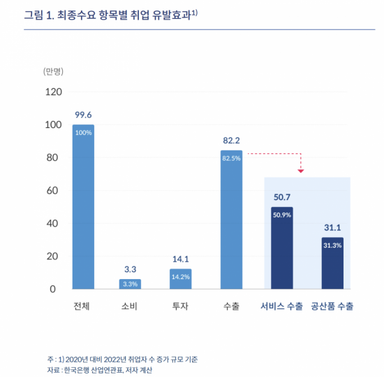 한국은행은 19일 홈페이지 내 블로그에 게재한 '서비스 수출이 늘어나면 질 좋은 일자리가 생긴다고요?'를 통해 이같이 밝혔다. 박영진 한은 경제통계2국 투입산출팀 과장은 "2020년 대비 2022년 국내 취업자 수(전업 환산 기준)는 99만6000명 증가했는데, 이 중 82.5%가 수출로 유발된 인원이었다"며 "특히 수출 중 서비스 수출로 유발된 인원은 50.9%로 절반 이상이었다"고 설명했다. 코로나19가 확산한 시기에 내수 부진에 따른 국내 고용시장 악화 압력을 취업유발 효과가 큰 서비스 수출이 상당 부분 완화했다는 것이다.