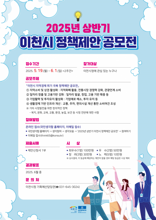 이천시 시정에 관심이 있는 누구나 응모할 수 있다. 희망자는 이메일이나 '국민생각함' 홈페이지의 '생각참여'-'생각모음'-'2025년 상반기 이천시 정책제안 공모전'에 접속해 제출하면 된다.