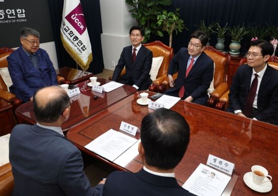 김문수 국민의힘 대선후보가 19일 서울 종로구 기독교회관을 찾아 김종혁 한국교회총연합회 회장 등 한교총 간부들과 대화하고 있다.