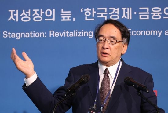 기우치 다카히데 노무라종합연구소 수석 이코노미스트가 21일 서울 중구 웨스턴조선호텔에서 열린 '2025 아시아금융포럼(Asisn Financial Forum 2025)'에 참석, '트럼프 관세와 세계 및 일본경제' 란 주제로 기조연설을 하고 있다.