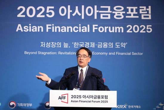 기우치 다카히데 노무라종합연구소 수석 이코노미스트가 21일 서울 중구 웨스턴조선호텔에서 열린 '2025 아시아금융포럼(Asisn Financial Forum 2025)'에 참석, '트럼프 관세와 세계 및 일본경제' 란 주제로 기조연설을 하고 있다.