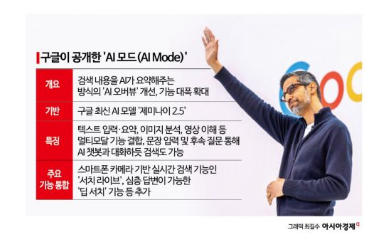 구글은 사용자가 검색한 내용을 AI가 요약해주는 방식의 'AI 오버뷰'의 이름을 'AI 모드'로 바꾸고, 기능을 대폭 확대했다. AI 모드에는 구글의 최신 AI 모델인 제미나이 2.5를 도입했다. 순다르 피차이 구글 최고경영자(CEO)는 기조연설을 통해 "AI 모드는 검색과 분석·요약·결과 제공까지 AI가 처리해 주는 경험을 원하는 사용자를 위한 새로운 기능"이라며 "정보에서 지능으로 나아가는 검색의 미래"라고 밝혔다.