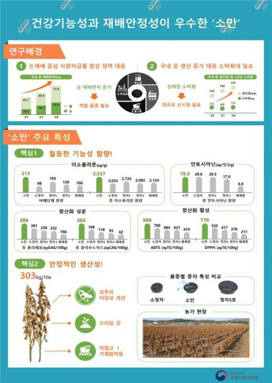 곽도연 농진청 국립식량과학원장은 "소만의 기능성 효과가 과학적으로 입증된 만큼 다양한 건강 기능성 식품 소재로 활용될 수 있도록 산업체와의 협력을 강화해 나가겠다"며 "앞으로도 디지털 육종 기술을 기반으로 한 기능성 콩 품종 개발에 박차를 가해 국산 콩의 새로운 수요 창출과 소비 확대에 앞장서겠다"고 말했다.