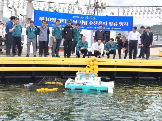 행사는 ▲기념사 및 인사말 ▲바다의 날 유공자 포상(도지사 표창 4명, 시장 표창 3명) ▲ 어업인 대표 바다 자율정화 실천 공동 결의문 낭독 ▲수산종자 방류(볼락 4000 미) ▲무인 수거로봇 시연 ▲육·해상 정화활동 순서로 진행됐다.