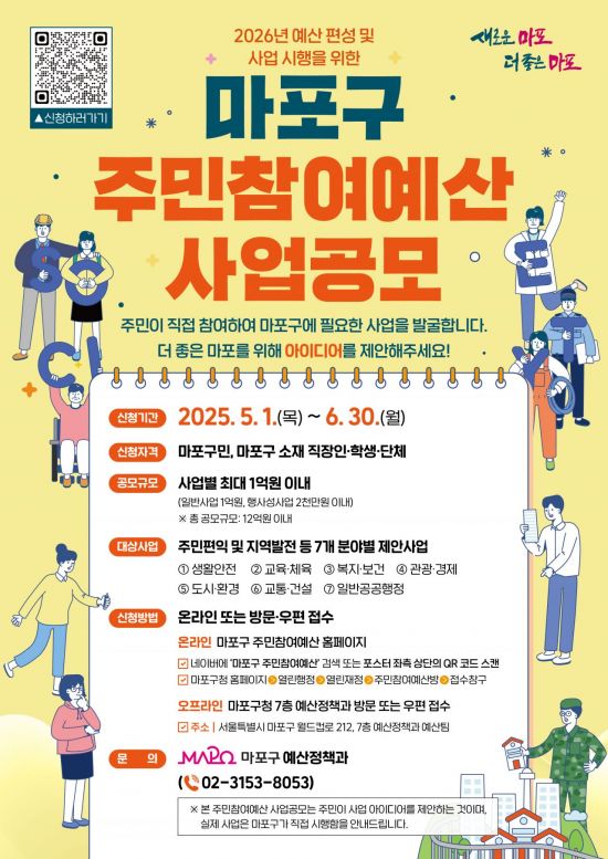 마포구(구청장 박강수)는 2026년 예산편성을 위한 '마포구 주민참여예산 사업' 공모 제안을 6월 30일까지 신청받는다.