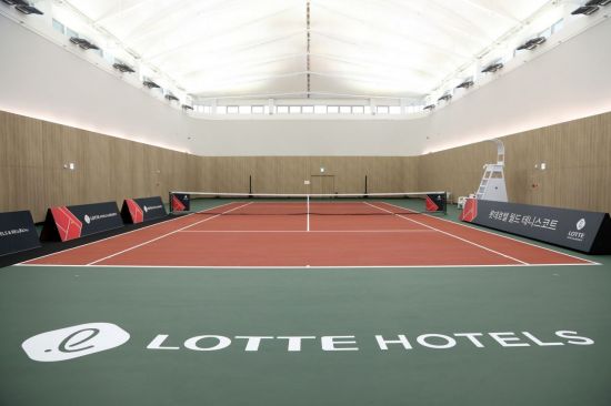 테니스코트는 롯데호텔 월드 5층에 마련했다. 기존 인도어 골프 연습장을 개보수해 일부 공간을 테니스코트로 조성했다. 974㎡(약 295평) 규모의 국제 규격을 갖춘 단면 코트로 천장 최고 높이는 아파트 6층에 달하는 13.8m로 시원한 개방감을 자랑한다. 바닥은 우레탄 소재에 아크릴 코팅을 더해 무릎 피로도를 낮추고 마찰력을 줄였다고 회사 측은 설명했다.