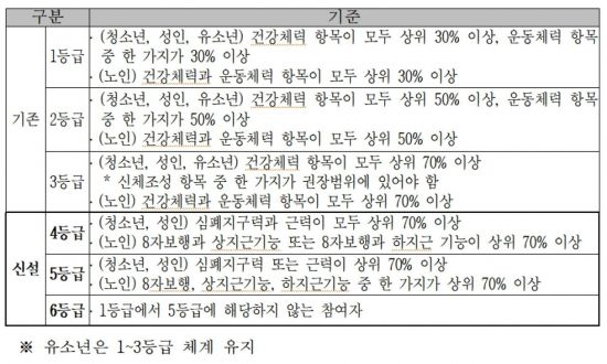 문체부는 이를 수용해 체력인증등급을 기존 3등급 체계에서 6등급 체계로 확대하도록 규정을 정비했다. 예를 들어 청소년과 성인의 경우 기존에는 근력, 근지구력, 심폐지구력, 유연성이 모두 상위 70% 이상이어야 등급을 부여받을 수 있었으나, 근지구력이나 유연성은 상위 70%에 못 미치더라도 심폐지구력 또는 근력 중 최소 한 가지만 70% 이상이면 등급을 부여받을 수 있도록 개정했다.