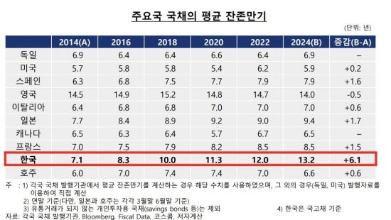 자본연에 따르면 국고채 평균 잔존만기는 2014년 7.1년에서 2024년 13.2년으로 크게 증가했다. 같은 기간 주요국의 평균 잔존만기 변동폭이 2년 이하에 그친 것과 대비되는 수치다. 장 연구위원은 "30년물은 다른 연물에 비해 도입 시기(2012년 9월)가 늦은 편이지만 이후 발행 비중이 지속적으로 확대되면서 2021년부터 연물 중 가장 큰 비중을 차지하고 있다"면서 "2024년에는 전체 국고채 발행의 30.2%가 30년물로 발행됐다"고 설명했다.