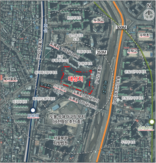 1호선 도봉역 인근 삼환도봉아파트가 최고 42층, 993가구로 재건축된다. 사업성보정계수를 적용받아 분양 가구수가 늘었다.