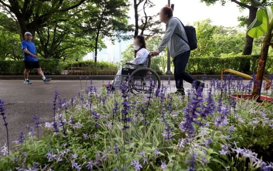 2025 서울국제정원박람회가 개막한 22일 서울 동작구 보라매공원에서 산책 나온 환자가 정원을 둘러보고 있다. 오는 10월 20일까지 열리는 이번 박람회는 자연과 도시가 조화를 이루는 ‘서울, 그린 소울’을 주제로 진행된다.