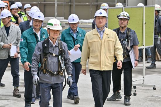 김이강 광주 서구청장이 22일 서구 화정아이파크에서 HDC현대산업개발, 국토안전관리원, 안전관리자문단 등 현장 관계자들과 함께 필러서포트 등 시설물 안전 점검을 실시하고 있다. 광주 서구 제공