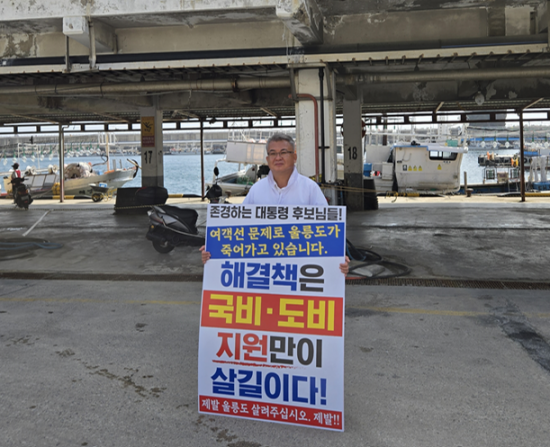 “근본적 대책은 국비와 도비를 신속히 확보해 비수기와 연중(주중) 할인 정책 등을 펼치는 것이 선사와 울릉군이 상생하는 길이다. 문제해결을 위해 도동삼거리와 여객선 터미널 등 거점에서 제21대 대통령 선거 후보님들께 간절함을 호소하는데 혼신의 힘을 쏟겠다”고 1인 시위 돌입 포부를 전했다.