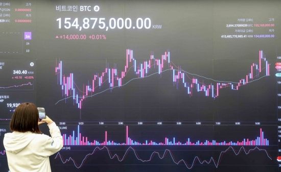 가상화폐 대장주 비트코인이 한때 11만9천900달러대까지 상승하며 고점을 높인 가운데 23일 서울 강남구 업비트 고객센터 전광판에 비트코인 시세가 표시돼 있다.