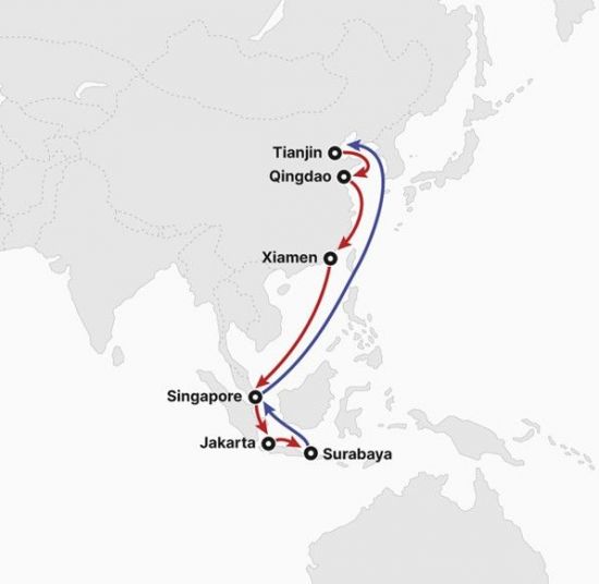 기항지는 톈진(중국)~칭다오~샤먼~싱가포르~자카르타(인도네시아)~수라바야~싱가포르~톈진 순이다.