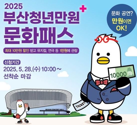 부산시가 청년에게 공연 관람 기회를 제공하는 '부산청년만원+문화패스' 신청을 받는다. 오는 28일 오전 10시부터 동백전 앱을 통해 선착순이다.