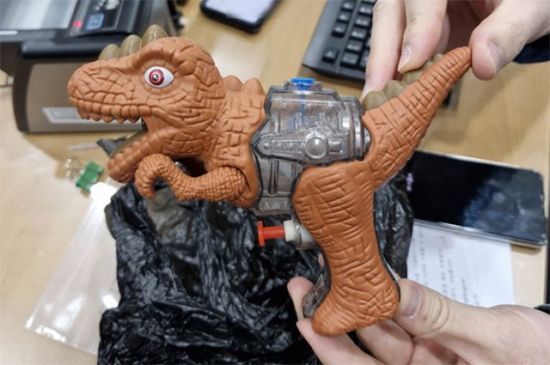 이 과정에서 A씨가 다른 곳을 보자 한 시민이 A씨의 총을 잡은 채 몸싸움을 벌였고, 이어 은행 직원 등 여러 명이 한꺼번에 A씨에게 달려들어 제압한 뒤 경찰에 넘겼다. 확인 결과 A씨가 범행에 사용한 공룡 모양의 장난감 물총은 8세 아들의 장난감이었던 것으로 드러났다.