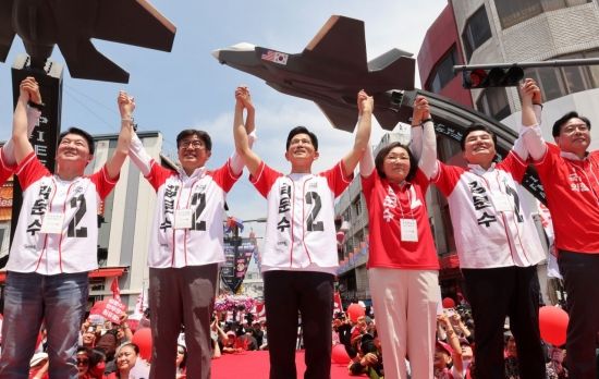 김문수 국민의힘 대선 후보가 26일 경기 평택시 K-55미군기지 정문 앞에서 유세를 하고 있다. 2025.5.26 김현민 기자