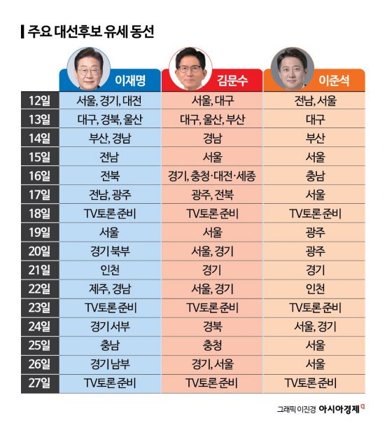 캐스팅보트 지역인 충청의 경우 김 후보는 수도권에서 영남으로 향하는 거점 성격으로 대전·천안·청주 등 대도시를 주로 방문했고, 25일에는 충남 계룡·논산·공주·보령·홍성·서산·당진·아산 등에서 집중 유세를 펼쳤다. 호남의 경우 지난 17일 광주·전주 일정이 전부다. 강원과 제주는 아직 방문하지 않은 상태다. 국민의힘 선대위 관계자는 "사전투표(29, 30일) 이전까지 우세 지역을 중심으로 약세·접전지를 골고루 돌며 지지세를 최대한 확보한 뒤 수도권으로 올라올 계획이라고 설명했다.