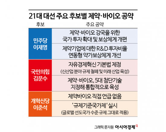 제약·바이오 업계의 요청도 R&D 지원 예산 확대 등 주요 후보들의 공약과 궤를 같이 한다. 한국제약바이오협회는 지난달 각 정당과 후보들에게 정책건의서를 전달하고 R&D 예산의 기업 지원 비율을 현재 13%선에서 30%대로 높이는 등 신약 개발 지원 생태계 조성에 힘써달라고 후보들에게 제안했다. 제약바이오협회는 "신약 개발에서 허가·출시까지 9~17년, 수천억~수조원이 소요되지만, 성공 확률은 2만3000분의 1 수준"이라며 블록버스터 신약(매출 1조원 이상 신약) 창출을 위한 5조원 규모의 메가펀드를 지속적으로 확대해 달라고도 요청했다.