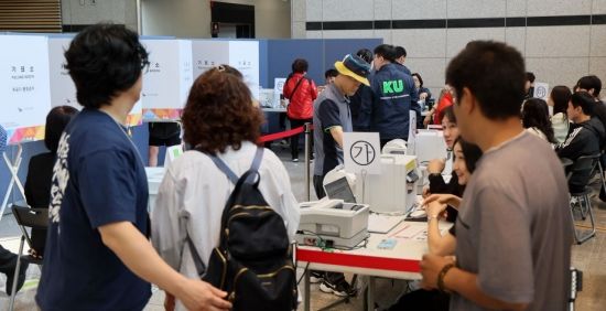 제21대 대통령선거 사전투표 첫날인 29일 서울 중랑구 중랑구청에 마련된 신내2동 사전투표소에서 유권자들이 투표하기 위헤 줄을 서고 있다.
