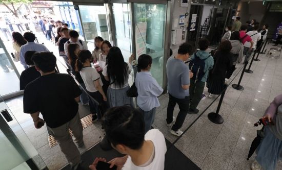 제21대 대통령 선거 사전투표 첫날인 29일 서울 강남구 역삼1동주민센터에 마련된 사전투표소를 찾은 유권자가 투표를 위해 줄을 서고 있다.