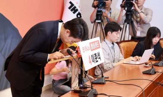 이준석 개혁신당 대선 후보가 29일 국회에서 열린 긴급기자회견에서 고개 숙여 인사하고 있다.