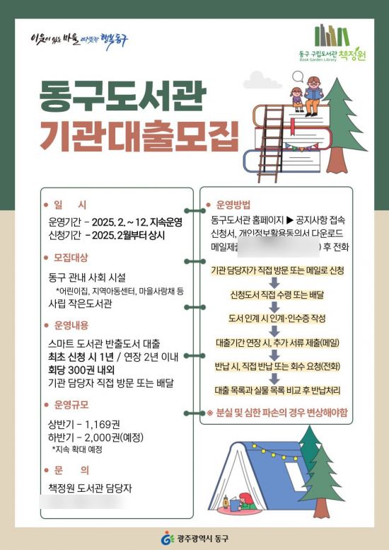 동구는 올해 하반기 6~7곳 기관을 대상으로 2,000여 권을 대출할 계획이다. 대출은 원하는 기관은 동구 도서관 누리집에서 관련 서류를 내려받아 작성 후 담당자 이메일로 보내면 된다.