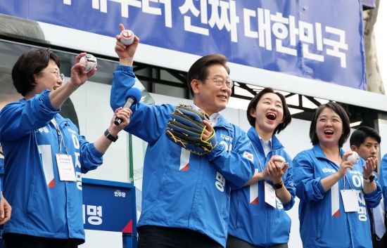 이재명 더불어민주당 대선 후보가 29일 서울 송파구 잠실야구장 광장에서 열린 강동구·송파구 집중유세에서 야구공을 던지는 퍼포먼스를 하고 있다.
