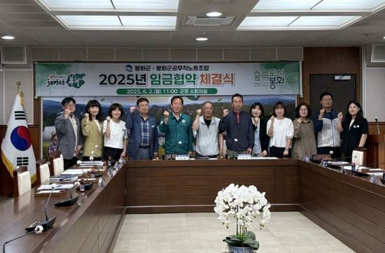 경북 봉화군과 봉화군 공무직노동조합이 지난 2일 군청 소회의실에서 '2025년 임금협약 체결식'을 갖고 공무직 근로자의 실질적 처우 개선과 조직 안정을 위한 임금 및 수당 조정에 공식 합의했다.