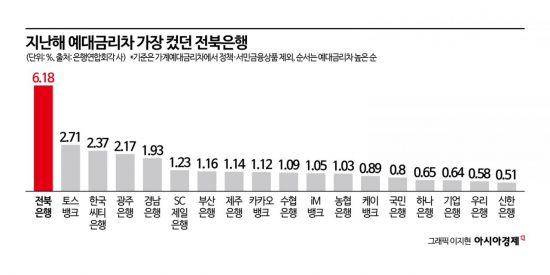 18개 은행 중 예대금리차가 가장 컸던 곳은 전북은행이다. 2023년에도 5.6%로 가장 높았던 전북은행은 가계대출금리와 예금금리의 차이가 6.18%였다. 뒤이어 토스뱅크가 2.71%를 기록했다. 토스뱅크도 2023년 3.79%로 2위를 차지했다. 전북은행과 토스뱅크의 차이는 2023년보다 더 벌어졌다. 2023년 1.81%포인트였던 1·2위 간 격차는 지난해 3.47%포인트로 증가했다. 전북은행은 "전북지역의 신용대출 보유고객의 소득 수준이 전국 최하위이며 은행권 중 다중채무자 취급 비중이 14%에 달해 열악한 환경에 있다"면서도 "가계대출 취급 비중 70% 이상을 중저신용자, 외국인 근로자 등 금융소외계층에게 지원해 예대금리차이가 상대적으로 높아 보일 수 있다"고 설명했다. 예대금리차가 가장 적었던 은행은 0.51%를 기록한 신한은행이다. 신한은행은 이에 대해 "지난해 9월 2단계 스트레스 총부채원리금상환비율(DSR) 시행 전까지 가계대출 차주 부담완화를 위한 정책을 지속했기 때문"이라고 설명했다.