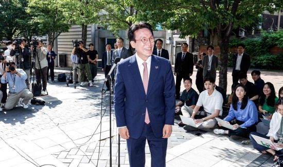 김민석 국무총리 후보자가 5일 서울 종로구 금융감독원 연수원에 마련된 인사청문 사무실에 출근하고 있다.