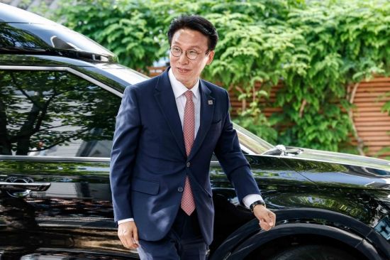 김민석 국무총리 후보자가 5일 서울 종로구 금융감독원 연수원에 마련된 인사청문 사무실에 출근하고 있다.