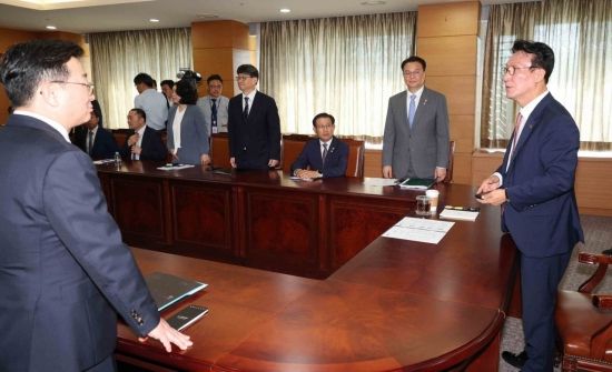김민석 국무총리 후보자가 5일 서울 종로구 금융감독원 연수원에 마련된 인사청문 사무실에서 열린 첫 회의에서 인사말 하고 있다.