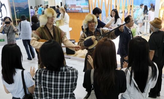 5일 서울 강남구 코엑스에서 열린 서울국제관광전을 찾은 관람객들이 카즈스탄 전통 공연을 보며 즐거운 시간을 보내고 있다.