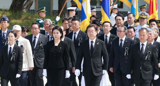 [속보]李대통령 "국민·국가 위한 희생, 기억·기록하고 책임 다해야" 이재명 대통령과 김혜경 여사가 6일 서울 동작구 국립서울현충원에서 열린 70회 현충일 추념식에서 현충탑 참배를 위해 이동하고 있다. 대통령실통신사진기자단