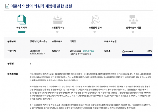 이준석 개혁신당 의원의 의원직 제명을 요구하는 국민청원이 40만 명에 육박했다. 6·3 대선이 끝난 가운데서도 여전히 지난 대선 TV 토론에서 이 의원이 여성 신체를 언급한 부적절한 발언을 한 데 대한 여파가 가시지 않는 분위기다. 9일 국회 국민동의청원 게시판에 지난 4일 올라온 '이준석 의원의 의원직 제명에 관한 청원'은 오후 10시 56분 기준 39만7967명의 동의를 얻은 것으로 나타났다.